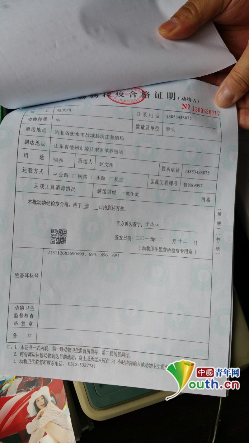 此后中國青年網記者致電編號為1300620717檢疫證明存根聯上的趙姓“承運人”進一步核實,對方告訴中國青年網記者,他以前確實到故城運過牛,但“都是半年前的事了”,并不是檢疫證明上寫的2月12號,而且數量也不對。檢疫證明是“通過中間人開的”,他并沒有見到,并且運的是6頭“奶?!?,并不是屠宰用的肉牛。